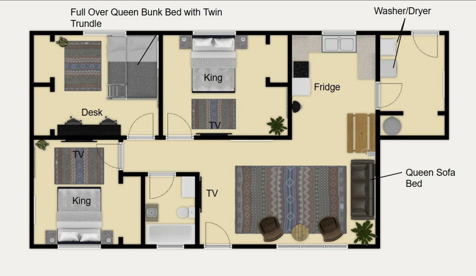 December 2025 5.00Great place! It was nearly perfect. It had basically anything you could think of and need. Check in was easy, check out was simple (no nonsense with crazy todos or anything). It was clean, well put together, felt homey and nice. My only beef (and this is really just a nitpick) is that some of the bedroom doors didn’t close properly. One of them just didn’t close at all (like the door was too big for the frame), and one wouldn’t click in. Tried pulling up in case the doors were just sagging, no luck. I very much recommend the place!