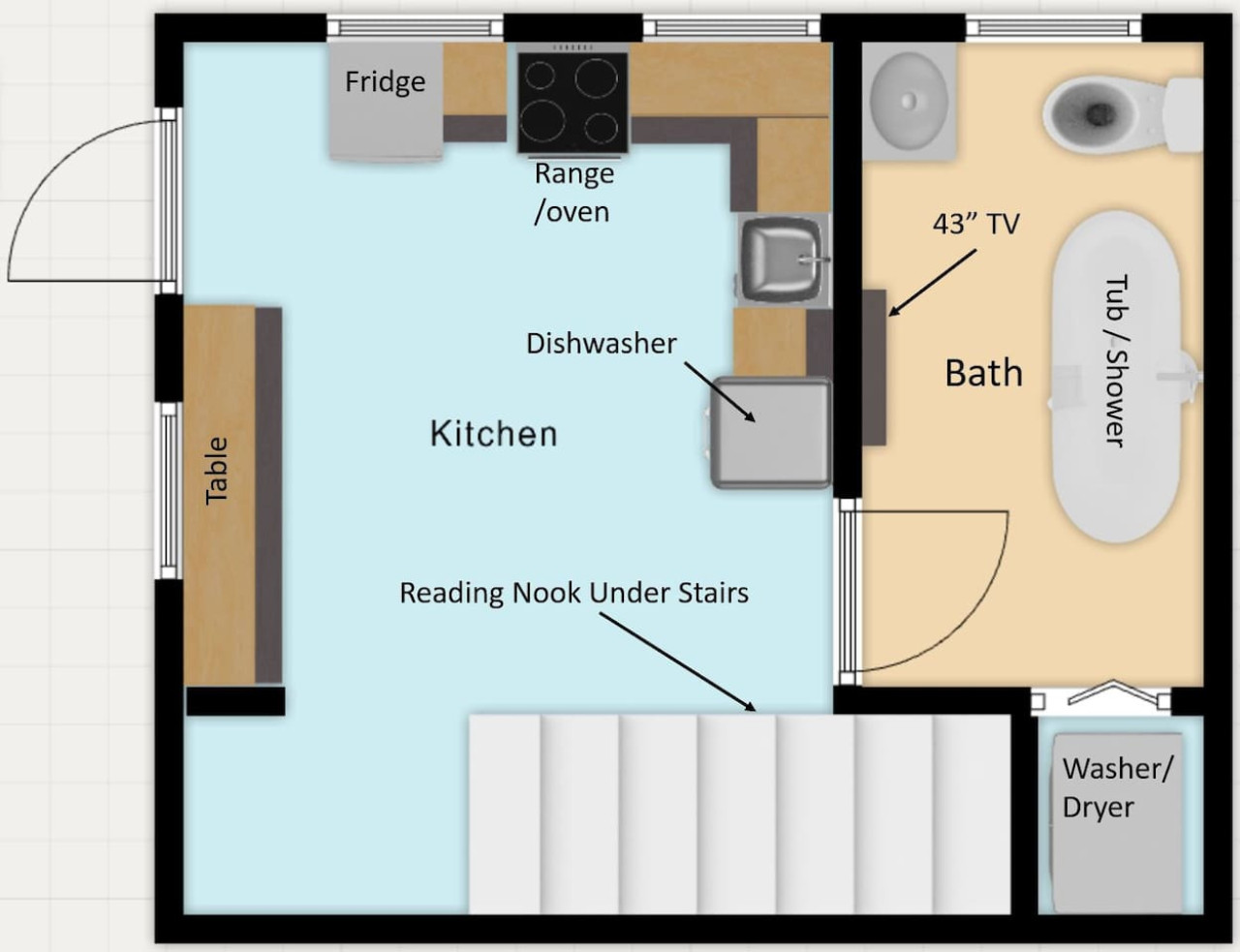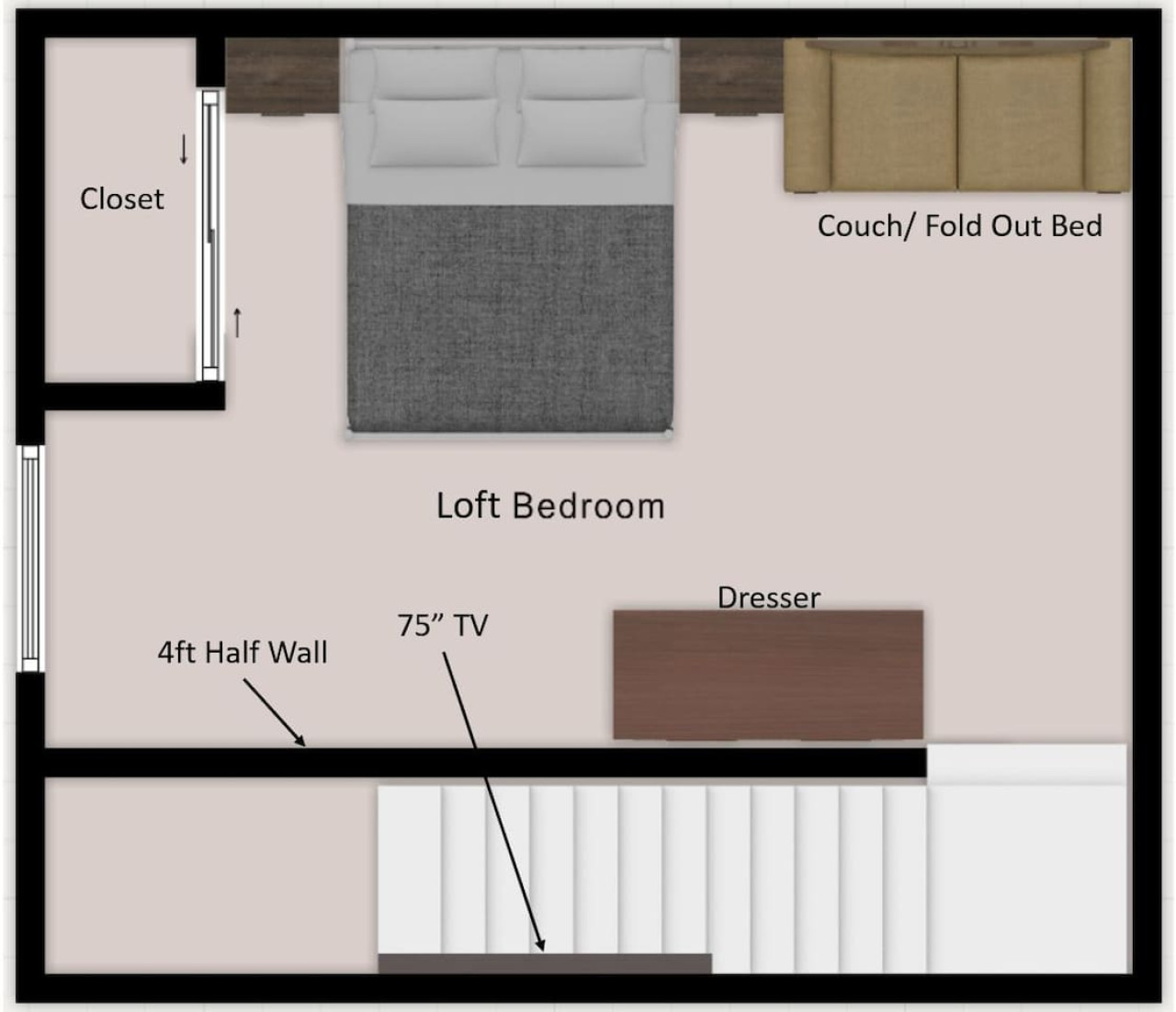 September 2024 5.00Charming space with great queen size bed for a good night sleep. Our Happy Anniversary treat was a bonus! Just a note that the bedroom and sitting/tv area is separate from the kitchen and bath on the second floor. There is a flight of stairs to navigate but they are wide and well lit.