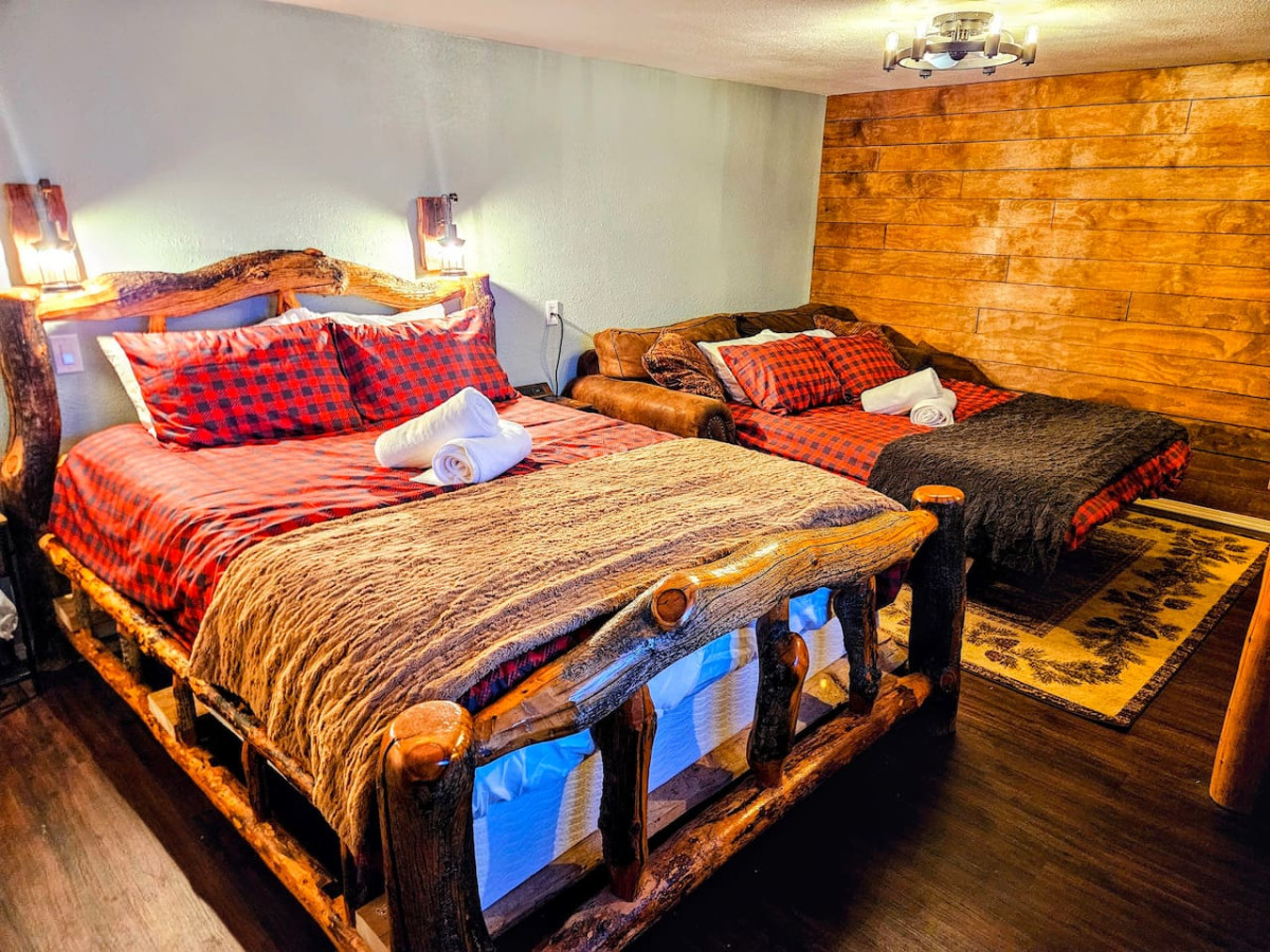 / night• Private Separate Cabin • 2 Person Farm Tub w/bubble bath, dimmable lights • 43” TV in Bathroom • Free Breakfast: Waffle Mix w/syrup, Coffee, Tea, Hot Cocoa • Fully Equipped Kitchen • 75” TV in Bedroom • Netflix | Disney+ | Paramount+ • Blu-Ray/DVD Player • Luxury Memory Foam Mattress • Queen Fold-out Sleeper Couch for 2 • Washer/Dryer • Traeger Smoker Grill • 1.4 Acre Shared Backyard • Free Parking • Free Kayak/SUP/Canoe Rentals • 10 min to Great Salt Lake/Antelope Island • 30 min to Skiing The Kayak Cabin is a romantic rustic cabin retreat for adventurers and those seeking a private relaxing stay with a warm luxury cabin feel. Located in a barn on the back of our 1.4 acre property in the valley between the Wasatch Mountains and the Great Salt Lake, it is completely private. It features a 43" bathroom TV viewable from a 2 person farm-style claw tub, Luxurious rustic log bed, couch bed, and 75" bedroom TV! Enjoy FREE Kayak, Stand Up Paddleboard, Canoe, and River Tube Rentals for all guests during your stay! The Kayak Cabin, the adjacent outdoor dining area with the table, chairs, and Smoker Grill. The rest of the yard is shared with the host family. You can also say hi to our 2 cute pigmy goats Gregory (brown and white), and Phillipe' (black and brown). You can contact us via the app. We do love to meet our guests but really leave the amount of interaction up to you. As a bonus for being our guest, please enjoy a Free rental (up to 1 per person per day) We also have kids, 2 goats, and a friendly dog name Kai who you may occasionally hear playing in our large 1.4 acre yard. Other things to note Please remember that you're staying in a house, not a hotel. Please treat the space with respect. If any problems arise, we will do our best to take action ASAP. Also this Cabin is NOT for those who struggle to go upstairs or step into free standing bath tubs.